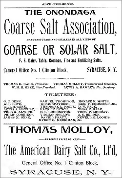 In the 1890s, many brands of dairy salt were available.[4] In England during this time, the Ashton and Higgins Eureka Salt brands were available (among others), and were used in the United States.[4] U.S. brands of dairy salt in the 1890s included Diamond Crystal Salt and Genesee Salt, among others.[4] Almost all of these brands were very pure, being 98–99% sodium chloride.[4]