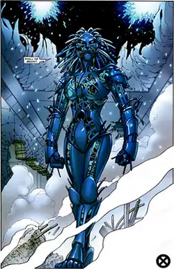 In Joss Whedon's Astonishing X-Men, the Danger Room developed self-awareness. It is mentioned by Wolverine as 'acting twitchy all semester'. The first thing it does is convince Wing, who has recently been depowered by Ord's cure, to kill himself.[7] The next thing it does is take control of an old, broken Sentinel robot and knock out all the psychics within the X-Mansion. During the Sentinel's attack, Cyclops orders Shadowcat and the students to go hide in the Danger Room for safety, finding the corpse of Wing. It reanimates Wing's corpse and attacks the students.[8] Apart from Wing, there are no additional fatalities among the students. After being freed from its prison, it takes the form of a woman dubbed "Danger" and attacks the X-Men. After defeating the X-Men, she travels to Genosha to kill Professor Charles Xavier.[9]