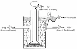 Froth flotation was adapted from the flotation process used in the mining industry in the 1960s. It is the most common deinking process in Europe used to recover recycled paper. Often most of the collector is added to the inlet of the flotation. The process temperatures are normally in the range 45 - 55 °C. Air is blown into the pulp suspension. The collector has affinity both to the ink particles and air bubbles, causing them to attach. The air bubbles lift the ink to the surface and form a thick froth that can be removed. Normally the setup is a two-stage system with 3, 4 or 5 flotation cells in series.[9] Flotation deinking is very effective in removing ink particles larger than about 10 μm.