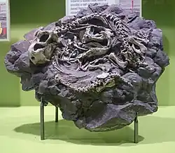More recently, the discovery of hair remnants in Permian coprolites possibly vindicates the status of dicynodonts as endothermic animals. As these coprolites come from carnivorous species and digested dicynodont bones are abundant, it has been suggested that at least some of these hair remnants come from dicynodont prey.[13] A new study using chemical analysis seemed to suggest that cynodonts and dicynodonts both developed warm blood independently before the Permian extinction.[14]
