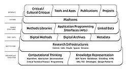 Berry and Fagerjord have suggested that a way to reconceptualise digital humanities could be through a "digital humanities stack", to map the different "activities, practices, skills, technologies and structures that could be said to make up the digital humanities".[8] This draws upon the way the term stack is used in computer science and in science and technology studies. For Berry and Fagerjord computational thinking and knowledge representation are the foundation of the stack, with other elements building upon these.[9]