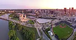 Panorama of Downtown Winnipeg. From left to right: The Forks, Broadway-Assiniboine, South Portage, Portage and Main. (The Exchange and Waterfront districts are located farther to the right and front.)
