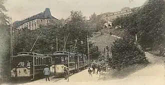 In addition to a freight car and a baggage car, seven tram cars were available for operation. The average speed was 12.5 kilometres per hour (7.8 mph) on the ascent and 11 kilometres per hour (6.8 mph) on the descent. The lower sixth of the railway line could be driven uphill at 18 kilometres per hour (11 mph).[2]