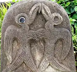 According to Barthel (1974), oral tradition has it that the island was first named "Te pito o te kainga a Hau Maka", meaning "The little piece of land of Hau Maka".[17] However, there are two words pronounced pito in Rapa Nui, one meaning "end" and one "navel", and the phrase can thus also mean "The Navel of the World". Another name, "Mata ki te rangi", means "Eyes looking to the sky".[18]