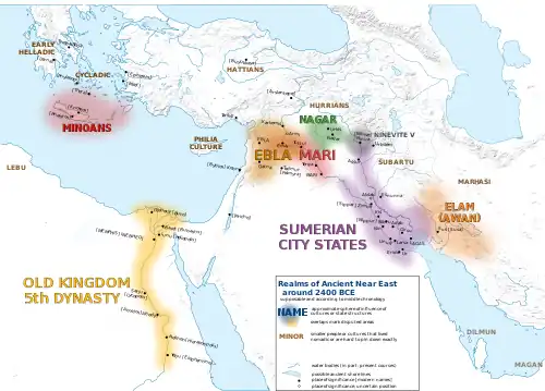 Mardikh I is followed by the first and second kingdoms era between about 3000 and 2000 BC, designated "Mardikh II".[11] I. J. Gelb considered Ebla as part of the Kish civilization, which was a cultural entity of East Semitic-speaking populations that stretched from the center of Mesopotamia to the western Levant.[12]