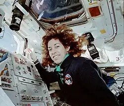 Ochoa became the first Hispanic woman to go to space[15][16] when she served on a nine-day mission aboard the Space Shuttle Discovery in 1993. The purpose of the Shuttle mission was to study the Earth's ozone layer. A veteran of four space flights, Ochoa has logged nearly 1000 hours in space.[17] She was a mission specialist on STS-56 (1993), was payload commander on STS-66, and was mission specialist and flight engineer on STS-96 and STS-110 in 2002.[1][18] Her third trip was for the STS-96 mission, which was a significant trip as it marked the first docking of a space shuttle with the International Space Station. On this mission, the crew delivered supplies, equipment, and performed a few experiments with the ISS. Dr. Ochoa's last trip was for the STS-110 mission, which was focused on the assembly of the ISS. Ochoa was in Mission Control during the Space Shuttle Columbia disaster and was one of the first personnel informed of television coverage showing Columbia's disintegration.[19]