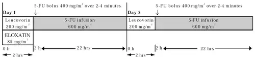 Day 1–2: Oxaliplatin 100 mg/m2 IV infusion, given as a 120 minutes IV infusion in 500 mL D5W, concurrent with leucovorin 400 mg/m2 (or levoleucovorin 200 mg/m2) IV infusion, followed by 5-FU 400 mg/m2 IV bolus, followed by 46-hour 5-FU infusion (2400 mg/m2 for first two cycles, and may be increased to 3000 mg/m2 if tolerated by patient (no toxicity > grade 1 during the first two cycles).