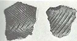 There was also a fair amount of Early Woodland Marion thick ware present; representing a possible occupation prior to the Wayne and Western Basin traditions, or indicating Early Woodland roots for either (or both) of the Late Woodland traditions.[1][6]