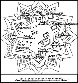 - ^ на доповіді Сената «Генваря 4 дня 1752 года подписано Ея императорского Величества рукою тако: быть по сему, а данную генерал майору Глебову инструкцию велено оной крепости учинить наперед план и для рассмотрения прислать в военную коллегию». Центральний державний військово-історичний архів Росії Ф.349, інв.№ 9, спр.1445, стор.2-4