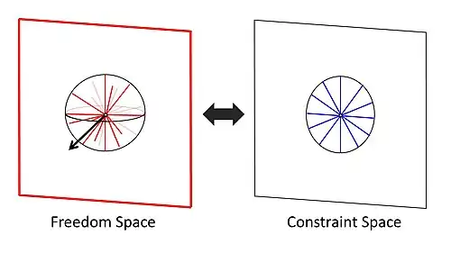 • Constraint Spaces guide the arrangement of flexible elements within a system to ensure it deforms only as intended. Each constraint space is complementary to a freedom space. They are modeled as wrench vectors.