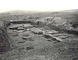 A paved road, delimited by vertical slab stones, runs parallel to the latter mortuary area. The construction of the road is supposed to be contemporary to the monumentalization of the necropolis.[35] The Bedini excavations have unearthed an area containing thirty two slab-cist tombs, made of a stone different from the one used in the serpentine-shaped area.[35] The cist tombs were mostly without their cover slabs, as these were wrecked during centuries of agricultural activities in the area. This so-called "Bedini's area" appears to have undergone three phases of development: