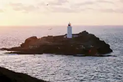 Godrevy (Cornish: Godrevi, meaning small farms) (/ɡəˈdrvi/ gə-DREE-vee)[1] is an area on the eastern side of St Ives Bay, west Cornwall, England, United Kingdom, which faces the Atlantic Ocean. It is popular with both the surfing community and walkers. It is part owned by the National Trust, and offshore on Godrevy Island is a lighthouse maintained by Trinity House which is said to be the inspiration for Virginia Woolf's novel To the Lighthouse.[2] Godrevy lies within the Cornwall Area of Outstanding Natural Beauty (AONB) and the South West Coast Path runs around the whole promontory. There are several public car parks on the western side where the National Trust owns and operates a café.[3]