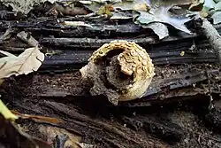 In 1952, a burnt golf ball was submitted to mycologists from an anonymous source in Lancashire, northwest England, and deposited in the Fungarium at Kew Gardens, London.[1][2] The submitter claimed it to be a specimen of a "rare fungal species" belonging to the genus Queletia, but mycologists thought its appearance more closely resembled Scleroderma citrinum, which has an irregular, nearly spherical sporocarp with thick leathery skin and colours that vary from white to tan or brown. The surface of a golf ball is dimpled and, when burned, its outer shell cracks to expose the rubber core, which is similar to the dark gleba of a mature S. citrinum sporocarp. Kew mycologists unsuccessfully attempted to collect spores from the specimen before realizing the nature of the hoax.[2]