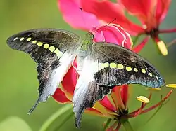 The body with white-grey hairs, the upperside of the head and thorax green. Upper surface of the wings silky black-green in the male somewhat paler and almost entirely without gloss in the female; forewing with a macular band extending from the apex to the middle of the hindmargin, which is often incomplete and is above green or yellow and scaleless, beneath green-white and scaled; hindwing elongate-triangular,with broad tail, the base and the abdominal margin to about the apex of the cell grey-white. The under surface blackish brown, distally to the hand of the forewing only with light and dark shadows, the hindwing, however, often with triangular costal patch as continuation of the band of the forewing; distinct submarginal spots are absent both above and beneath. Full-grown larva yellowish green, the 3 thoracic segments each with a pale red spine at either side, a similar pair of spines on the last segment, the stigmata blue, on segments 4, 11 and 12 a number of small blue dorsal spots (Kuhn). According to Wahnes the larva has in New Guinea a large brown dorsal spot, yellow-edged posteriorly, which extends from the 3rd to the 5th segment, and a smaller brown spot on the 11. segment.Pupa pale green, slightly bluish or yellowish, head obtuse, rounded, with only very feebly produced angles; thoracic horn sharply pointed, with brown tip, the lateral keel running out into the margin of the wings straight, the small lateral tubercle of the mesothorax pointed, without brown spot.[1]