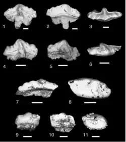 Gregoriidae is an extinct family of early chondrichthyans from the Carboniferous period.[2] It currently includes three described genera: Gregorius, Srianta, and Bealbonn. This family includes remains formerly ascribed to "Desmiodus," which is now considered a nomen vanum.[3] The relationships between the included genera are not entirely clear.[4] Fossils are known from Serpukhovian-aged formations including the Bear Gulch Limestone and Surprise Canyon Formation.[5]