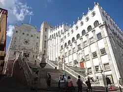The Spanish found deposits of gold here in the 1540s and soon they sent soldiers and built forts.[10] In 1548, the outpost was formally established with the name of Real de Minas de Guanajuato by viceroy Don Antonio de Mendoza.[4][5] Despite Chichimeca attacks, the population of the area grew rapidly with the arrival of Spanish and Creole migrants and indigenous and mestizo traders and workers.[6][10] It was soon declared a town with the name of Santa Fe Real de Minas de Guanajuato, with Preafán de Rivera as mayor. Its first church was consecrated in 1555,[6] and it was named an “alcaldía mayor” in 1574.[4][5]