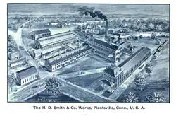 The H. D. Smith & Co. was founded in 1850 by Henry D. Smith, who had invented machinery for automating the manufacture of previously handmade iron parts for carriages. Originally located in Meriden, Smith moved the company to Plantsville, and built this factory around 1882. It was originally much larger, having a large U shape with an open courtyard, and was considered a local showpiece of design. The surviving building represents the northernmost leg of the U. The company shifted to the production of bicycle parts in the 1890s, and the manufacture of toolkits for automobiles in the early 20th century. It failed in the 1920s, after which the factory stood vacant. In 1938 it was purchased by the Florian family, who owned the American Standard Company, a maker of gardening tools.[2] In August 2015, the building, as well of the remainder of the old H. D. Smith & Co. Works, was purchased by Jon Rondeau, with plans to turn it into a high-end whiskey and bourbon distillery.[4]