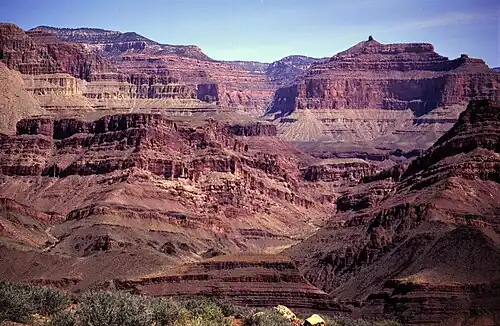 The summit spire is composed of cream-colored Permian Coconino Sandstone. This sandstone, which is the third-youngest stratum in the Grand Canyon, was deposited 265 million years ago as sand dunes. Below the Coconino Sandstone is slope-forming, Permian Hermit Formation, which in turn overlays the Pennsylvanian-Permian Supai Group. Further down are strata of the cliff-forming Mississippian Redwall Limestone, Cambrian Tonto Group, and finally Proterozoic Unkar Group at creek level.[8]