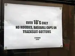 In the UK, hoodies have been the subject of much criticism; some shoplifters have used the hood to conceal their identities from CCTV cameras in shopping centres.[19] The hoodie became a popular clothing item by the 1990s. By the 21st century, it had gained a negative image, being associated with anti-social behaviour. It became one of the later items associated with "chavs", or Neds.