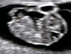 Artificially colored – gestational sac, yolk sac and embryo (measuring 3 mm at five weeks)
