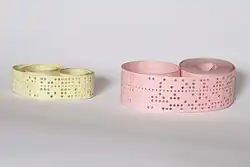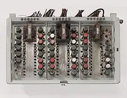Early electronic computers such as Colossus made use of punched tape, a long strip of paper on which data was represented by a series of holes, a technology now obsolete.[29] Electronic data storage, which is used in modern computers, dates from World War II, when a form of delay-line memory was developed to remove the clutter from radar signals, the first practical application of which was the mercury delay line.[30] The first random-access digital storage device was the Williams tube, which was based on a standard cathode ray tube.[31] However, the information stored in it and delay-line memory was volatile in the fact that it had to be continuously refreshed, and thus was lost once power was removed. The earliest form of non-volatile computer storage was the magnetic drum, invented in 1932[32] and used in the Ferranti Mark 1, the world's first commercially available general-purpose electronic computer.[33]