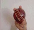An inswinger is bowled by holding the cricket ball with the seam vertical and the first two fingers slightly across the seam so that it is angled a little to the leg side. Once the ball has worn and been polished so that one side is rougher than the other, the rough side is placed on the leg side. The ball is placed on the pad of the thumb. This thumb position locks the wrist in a position inclined to the leg side.