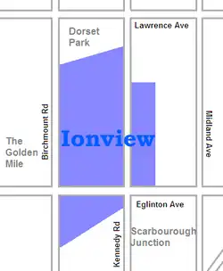 Ionview is a neighbourhood in Toronto, Ontario, Canada, in the district of Scarborough. It is bounded by Birchmount Road to the west, the hydro transmission corridor north of Ranstone Gardens to the north, the CNR railway to the east, and Eglinton Avenue East, Kennedy Road and the CNR railway to the south.