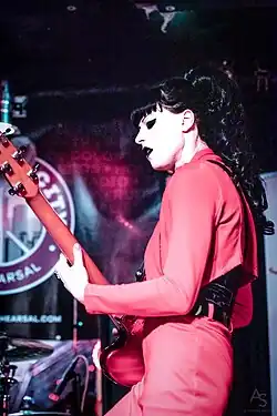 Since 2018, White has been playing EVH Wolfgang guitars, which are Eddie Van Halen's signature model.[171] White uses numerous effects to create his live sound, most notably a DigiTech Whammy WH-4 to create the rapid modulations in pitch he uses in his solos.[172] White also produces a "fake" bass tone by playing the Kay Hollowbody and JB Hutto Montgomery Airline guitars through a Whammy IV set to one octave down for a very thick, low, rumbling sound, which he uses most notably on the song "Seven Nation Army".[172] He also uses an MXR Micro Amp and custom Electro-Harmonix Big Muff Distortion/Sustainer.[164] In 2005, for the single "Blue Orchid", White employed an Electro-Harmonix Polyphonic Octave Generator (POG), which let him mix in several octave effects into one along with the dry signal.[161] He plugs this setup into a 1970s Fender Twin Reverb "Silverface" and two 100-Watt Sears Silvertone 1485 6×10 amplifiers.[161][162] He also used a 1960s Fender Twin Reverb "Blackface".[161][162]