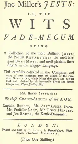 After Miller's death, John Mottley (1692–1750) brought out a book called Joe Miller's Jests, or the Wits Vade-Mecum (1739), published under the pseudonym of Elijah Jenkins Esq. at the price of one shilling. This was a collection of contemporary and ancient coarse witticisms, only three of which are told of Miller.[2] This first edition was a thin pamphlet of 247 numbered jokes. This ran to three editions in its first year.