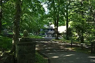 The John Shepard House is located in a residential area on the north side of Norfolk village. It is set on the south side of Shepard Road, roughly midway between Mills Lane and Maple Avenue. It is a sprawling 2+12-story structure, built mainly of rubblestone, with a central rectangular section flanked by wings set at an angle. The style roughly resembles that of a Swiss chateau, with heavy dark chestnut clapboards and a recessed porch with balcony above. The roof has a shallow pitch, and is pierced by truncated gable dormers. Windows are irregular in size and spacing, and are typically fitted with small panes. The interior is divided into public spaces in the center and north wing ground floors, bedrooms above those, and the service and servants wing to the south.[2]