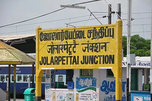 Jolarpettai Junction (also known as Tirupattur - Jolarpet Junction [1])(station code: JTJ[2]) is an NSG–3 category Indian railway station in Chennai railway division of Southern Railway zone.[3] It is located in the Tirupattur district of Tamil Nadu. Jolarpettai Junction falls within Chennai Central- Bangalore City Line via Bangarapet Junction, Krishnarajapuram and Jolarpettai–Shoranur line leading to Kerala trunk via Salem Jn, Erode Jn, Coimbatore Jn, Palakkad Jn and hence connect Chennai to Mangalore through ShoranurJn, Kozhikode and Kannur. Chennai to Thiruvananthapuram through Thrissur, Ernakulam Jn and Kollam Jn .[4]