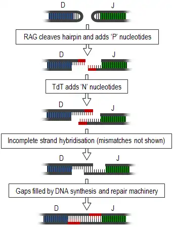 Generation of junctional diversity starts as the proteins, recombination activating gene-1 and -2 (RAG1 and RAG2), along with DNA repair proteins, such as Artemis,[2] are responsible for single-stranded cleavage of the hairpin loops and addition of a series of palindromic, 'P' nucleotides. Subsequent to this, the enzyme, terminal deoxynucleotidyl transferase (TdT), adds further random 'N' nucleotides. The newly synthesised strands anneal to one another, but mismatches are common. Exonucleases remove these unpaired nucleotides and the gaps are filled by DNA synthesis and repair machinery.[1][3] Exonucleases may also cause shortening of this junction, however this process is still poorly understood.[4]