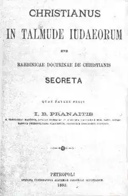 Justinas Bonaventūra Pranaitis (Russian: Иустин Бонавенту́ра Пранайтис; 27 July 1861 – 28 January 1917)[1] was a Lithuanian Catholic priest. He was a professor of Hebrew at the Saint Petersburg Roman Catholic Theological Academy and missionary in Uzbekistan. He is best known as the author of The Talmud Unmasked, and his subsequent involvement as a witness in the Bellis trial.