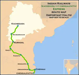 The 17652 / 51 Kacheguda–Chengalpattu Jn Express runs from Kacheguda via Gooty, Cuddapah, Renigunta Junction, Arakkonam Junction,Chennai Egmore , Tambaram, Chengalpattu Jn, Villupuram Junction to Puducherry.