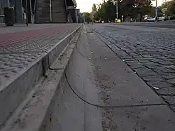 A Kassel kerb is a design of kerb (curb in US English) that features a concave-section that allows for an easier alignment for buses. The kerb was first introduced in the German city of Kassel for the low-floor tram system but has since been adopted for use at traffic stops.[1][2] Kassel kerbs can be part of a bus stop kerb, designed for low-floor buses that serve an elevated bus stop platform.