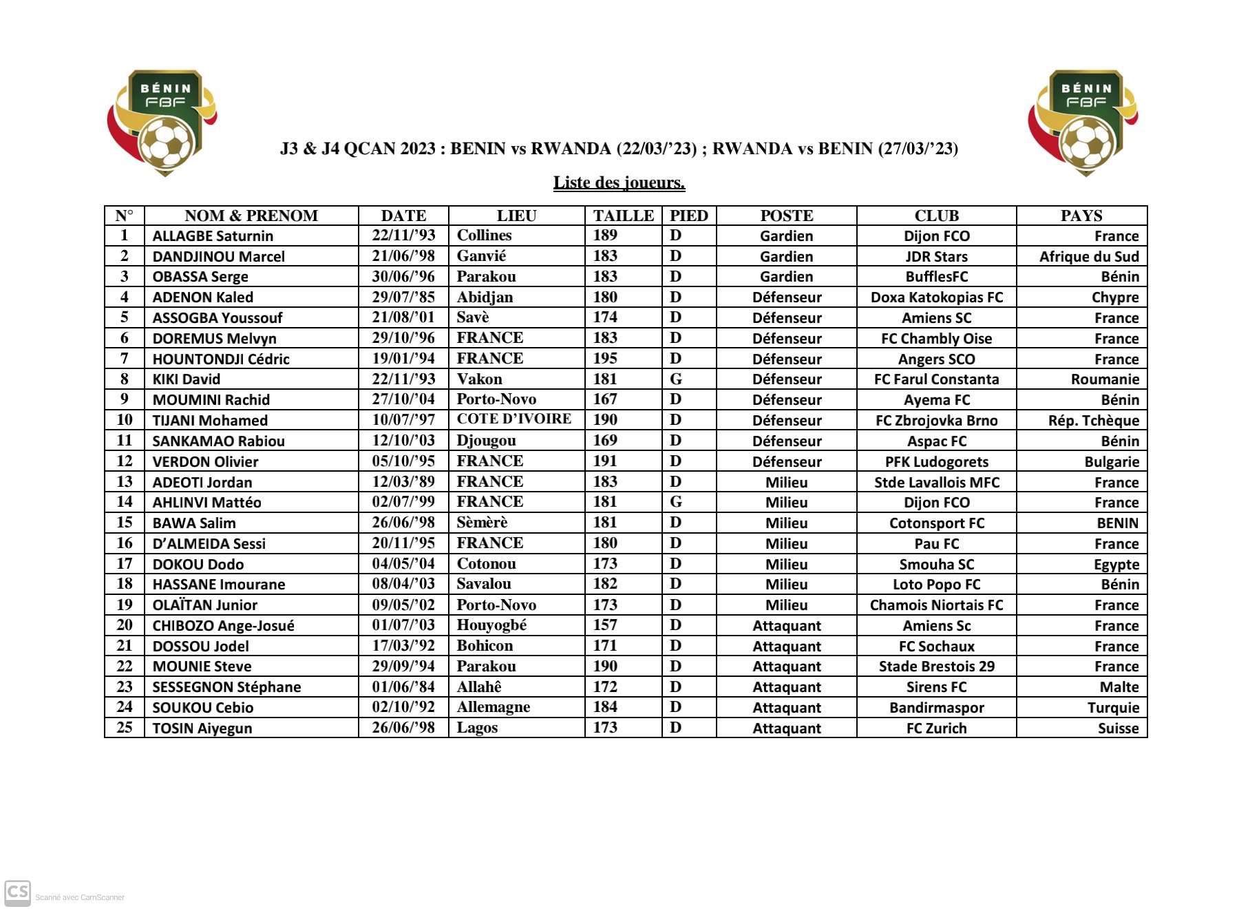 2. ^ Mamrud, Roberto (23 July 2023). "Benin - Record International Players". RSSSF. Retrieved 21 October 2023.
