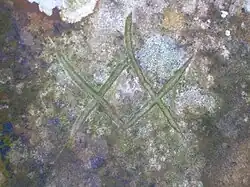 A Mason's Mark on a stone from the old deer park wall, suggesting that the stones came from old Kilwinning Abbey