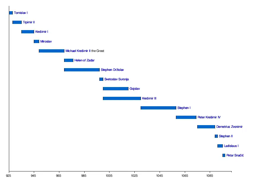 Petar SnačićLadislaus I of HungaryStephen II of CroatiaDemetrius ZvonimirPeter Krešimir IVStephen I of CroatiaKrešimir IIIGojslav of CroatiaSvetoslav SuronjaStephen DržislavHelen of ZadarMichael Krešimir IIMiroslav of CroatiaKrešimir ITrpimir IITomislav of Croatia