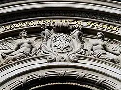 The exterior is decorated with rosettes and masks.[9] The Greek muses Melpomene and Terpsichore, made by the sculptor Emilio Sala, are above the entrance.[15] The building has a curved façade decorated with stucco work and narrow, deep arches. It was planned that Kyiv's coat of arms, along with the city's patron saint, the Archangel Michael would be placed on the roof above the entrance.[1] After protests from the Metropolitan of Kyiv, Theognostus who declared that placing an image the saint would be blasphemy.,[22] an allegoric composition consisting of griffins holding a lyre was used instead.[1]