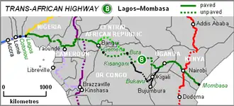 The Lagos–Mombasa Highway (also known as the Mombasa-Lagos Highway) or TAH 8 is Trans-African Highway 8 and is the principal road route between West and East Africa. It has a length of 6,259 km (3,889 mi) and is contiguous with the Dakar-Lagos Highway with which it will form (when complete) the longest east-west crossing of the continent for a total distance of 10,269 km (6,381 mi). Its main importance at the moment is connecting West Africa with Southern Africa via Yaoundé and Gabon because the section through the Democratic Republic of the Congo is unpaved and difficult.