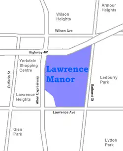 Lawrence Manor is a neighbourhood in the city of Toronto, Ontario, Canada. This neighbourhood is bounded by Bathurst Street on the east, Highway 401 to the north, the Allen to the west, and Lawrence Avenue to the south. The western side of the area borders along Bathurst Heights and the large public housing project.