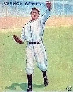 The New York Yankees purchased Gomez from the Seals for an estimated $39,000.[3] He reported in at 6 feet 2 inches (1.88 m) and weighing in at 147 pounds (67 kg). This scared many people that he was not ready for the big leagues. Gomez made his major league debut on April 29, 1930. He pitched in only 15 games and finished the season with a 2–5 win–loss record, a 5.55 earned run average (ERA). Coming into the 1931 season, Gomez had good pitching velocity, but the Yankees were concerned about the pitcher's slender frame of 6 feet 2 inches (1.88 m) and 155 pounds (70 kg). Following a common medical strategy of the time, the team had most of his teeth extracted; they also had him drink 3 US quarts (2,800 ml) of milk daily and gave him an unlimited meal allowance for road games. Gomez registered the second-best ERA in the American League in 1931.[4]