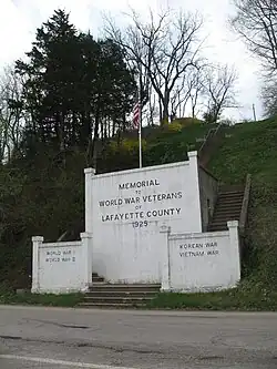 ![]() After crossing the Lexington Bridge over the Missouri River, visitors were greeted with a war memorial at a "T" intersection. | |