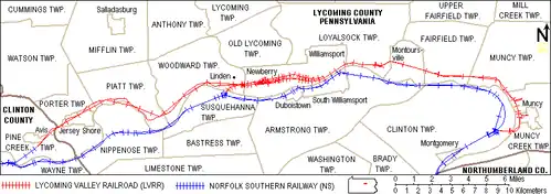 Map of the Lycoming Valley Railroad (red) and Norfolk Southern Railway (blue) lines in Lycoming County.