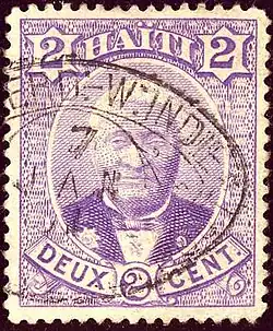 On August 18, 1879, Salomon returned to Haiti and became president with huge support from the people. His rise to power was anticipated by General Richelieu Duperval, who carried out a coup d'état on the night of October 2–3 that deposed the provisional government of Lamothe-Hérissé.[5] After the coup, another provisional government was installed, presided over by Florvil Hyppolite and composed of General Duperval, Seide Thélémaque, Tirésias Simon Sam and also Salomon, who was appointed as minister of finance and foreign affairs.[6][7] On October 23, the National Assembly elected Salomon for a seven-year term.[5] His presidential inauguration took place 3 days later, on October 26.[8] His plan as president was to restart public education, fix Haiti's financial woes, restore agriculture productivity, improve the army, and to fix the public administration. Within four months, he established the National Bank of Haiti, and by 1880 he resumed debt payments to France. The 1880s saw a huge amount of effort by the Salomon administration to bring modernization to Haiti. He adhered to the International Postal Union and issued its first postage stamp. In October, he granted a British cable company the right to connect Port-au-Prince and Kingston, Jamaica, and by 1887 he negotiated to link Môle-Saint-Nicolas to Cuba. He restructured the medical school, imported teachers from France for the Lycées, and more. The Armed Forces of Haiti were reorganized to 16,000 and assigned to 34 infantry regiments and 4 artillery regiments. Salomon also reorganized the ranking distribution in the army, which only included privates and generals.