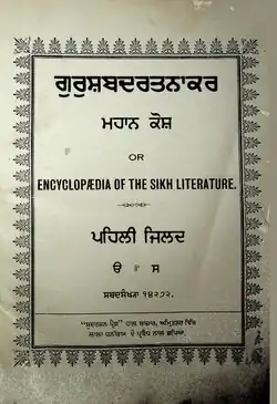 Guru Shabad Ratnakar Mahan Kosh (Punjabi: ਗੁਰਸ਼ਬਦ ਰਤਨਾਕਰ ਮਹਾਨ ਕੋਸ਼), known by its more popular name of Mahan Kosh (ਮਹਾਨ ਕੋਸ਼) and by the English title Encyclopædia of the Sikh Literature, is a Punjabi language encyclopedia and dictionary which was compiled by Bhai Kahn Singh Nabha over fourteen years.[1] It was the first Punjabi encyclopedia, it contains more than 70,000 words, some of them has sufficient reference from Guru Granth Sahib, Dasam Granth, Gur Pratap Suraj Granth and from other Sikh books. It is considered a groundbreaking work in terms of its impact and its level of scholarship.[2]