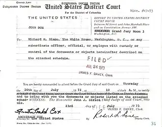 Marbury also established that the power of judicial review covers actions by the executive branch—the President and his cabinet members. However, American courts' power of judicial review over executive branch actions only extends to matters in which the executive has a legal duty to act or refrain from acting, and does not extend to matters that are entirely within the President's discretion, such as whether to veto a bill or whom to appoint to an office. This power has been the basis of later important Supreme Court decisions. In its 1974 decision United States v. Nixon, for example, the Supreme Court held that President Richard Nixon had to comply with a subpoena to provide tapes of his conversations for use in a criminal trial related to the Watergate scandal, which ultimately led to Nixon's resignation.[63][64]