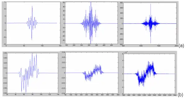 Mathieu wavelets can be derived from the lowpass reconstruction filter by the cascade algorithm. Infinite Impulse Response filters (IIR filter) should be use since Mathieu wavelet has no compact support. Figure 3 shows emerging pattern that progressively looks like the wavelet's shape. Depending on the parameters a and q some waveforms (e.g. fig. 3b) can present a somewhat unusual shape.