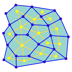 The animation shows the maze generation steps for a graph that is not on a rectangular grid. First, the computer creates a random planar graph G shown in blue, and its dual F shown in yellow. Second, the computer traverses F using a chosen algorithm, such as a depth-first search, coloring the path red. During the traversal, whenever a red edge crosses over a blue edge, the blue edge is removed. Finally, when all vertices of F have been visited, F is erased and two edges from G, one for the entrance and one for the exit, are removed.