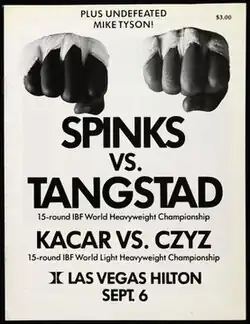 The Spinks–Tangstad main event was supplemented with a Bobby CzyzSlobodan Kačar IBF light heavyweight title bout, in which Czyz would win his first of two world titles by knocking out Slobodan Kačar in the fifth round.[8] Also on the undercard, Mike Tyson knocked out Alfonso Ratliff in the second round in what was his final fight before entering the heavyweight unification series and challenging Trevor Berbick for the WBC heavyweight title.[9]